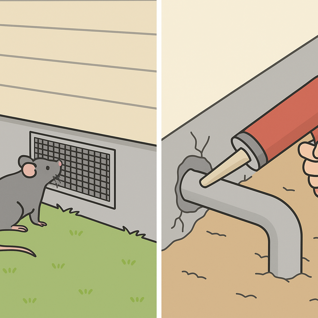 まずは外周を一周して、①床下換気口の格子・パネルの破損 ②基礎と外壁の取り合い ③配管の立ち上がりの隙間 を点検しましょう。応急処置としては金網・防鼠パネルの追加や、 専用パテでの隙間封鎖が有効です(下図参照)。